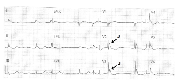 The first report of this ECG finding was made in 1938 by Tonpshewski3 in a man who had been exposed for many hours at low temperatures while the detailed description was made by Osborn4 in 1953. It is considered to be a pathognomonic ECG finding of hypothermia but can also rarely be seen in cases of hypercalcemia, severe subarachnoid haemorrhage, severe craniocerebral injury, in Brugada syndrome and vasoconstrictive coronary artery disease (Prinzmetal's angina).5,6 When the body temperature drops below 320C, atrial fibrillation is often seen and with furthermore reduction (28-30oC) ventricular tachycardia and fibrillation occur. Finally, when the temperature drops below 27oC, cardiac asystole is observed.