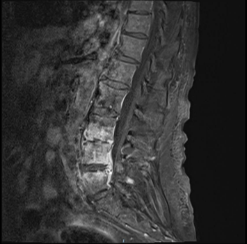 A comprehensive clinical evaluation, including laboratory tests, imaging studies, and blood cultures, was conducted to establish a differential diagnosis for the patient's lumbar pain and systemic symptoms. Laboratory work revealed elevated C-reactive protein (CRP) levels (100 mg/L), hypercalcemia (15.3 mg/dL), and positive blood cultures for *S. epidermidis*. Imaging studies included a transthoracic echocardiogram (TTE) showing a previously documented mitral valve prolapse and a PET-CT scan that revealed high uptake in the lumbar vertebrae (L3, L4, L5). Subsequent lumbar MRI with contrast confirmed the presence of phlegmonous inflammatory changes suggestive of spondylodiscitis (Figure 1 & 2).