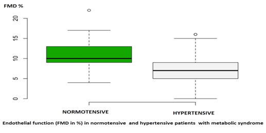 In this group of patients with metabolic syndrome there are no significant differences between normotensives and hypertensives, except older age and a higher Score Risk in hypertensives. We conducted a stress test and flow mediated dilatation of the brachial artery for endothelial function (EF). The studies were blinded for the crossover results. Each patient underwent a symptom-limited maximal exercise testing. The tests were stopped if the patient requested to stop due to exhaustion, or the physician stopped the test due to medical reasons. The physicians stopped the test either due to symptoms or positive high-risk features, including a drop in systolic BP of >20 mm Hg with increasing workload, high-risk ST-changes, and sustained ventricular tachycardia. The parameters recorded during the stress test were: symptoms, continuous heart rate and ECG, and every 3 minutes BP recordings. The patients were monitored during recovery for symptoms, vital signs, and ECG for the first 3 minutes if they were stable, or longer if any abnormalities were noted. Brachial flow-mediated endothelial-dependent dilation (FMD) is a validated physiologic measure of the endothelial function.5