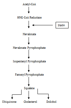 Figure 1 The mevalonate pathway. HMG-CoA reductase is inhibited by statins which affects ubiquinone synthesis.