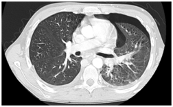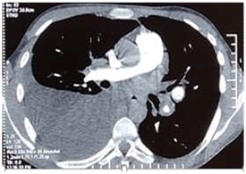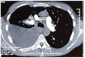 A 21-year-old man was followed for six months in the internal medicine department for Hughes-Stovin syndrome. He presented with pulmonary arterial aneurysms (Figure 1) thrombosis of the hepatic and inferior vena cava veins and recurrent bipolar aphthosis. The patient was treated with colchicine mg per day, oral corticosteroid 60mg per day and monthly boli of cyclophosphamide. The evolution was marked by the occurrence of a state of epilepticus complicated by inhalation pneumopathy due to Staphylococcus Aureus requiring intubation and mechanical ventilation for eight days in intensive care unit. Status epilepticus could not be explained by metabolic, toxic, infectious or iatrogenic causes. There was no concept of trauma and the brain scanner was without abnormalities. Magnetic resonance brain imaging with gadolinium injection showed no parenchymal or vascular lesions. The electroencephalogram showed a non-abnormal pattern. An improvement in the neurological state with no seizure recurrence was obtained under anti-epileptic treatment. The pulmonary examination showed clinical improvement and radiological cleansing. Two weeks later, the patient experienced chest pain with acute dyspnea. The examination found an increase in the sonorityduring percussion of the thorax with a decrease in respiratory sounds in auscultation. Chest X-ray and thoracic computed tomography scan showed the presence of a left medium-sized pneumothorax (Figure 2A), associated with fusiform aneurysmal dilatationof the apical branch of the Lingula (Figure 2B), and posterolateral atelectasis of the left lower lobe containing pneumatocele blebs. The pneumothorax extended rapidly and became bilateral. The patient was transferred to a resuscitation unit undergoing a chest drainage. The course was marked by severe respiratory distress requiring intubation.The patient had died with an unexplained etiology.