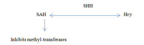 Hcy (previously obtained from Met) is further recycled in Met. The compound receives an adenosine group from ATP, through a reaction catalyzed by the enzyme adenosyl-Methionine-synthetase (MAT), and is converted in S-Adenosyl-Methionine (SAM), via trans-methylation pathway. After the transfer of the methyl group (-CH3) to an acceptor molecule, SAM is converted in S-Adenosyl-Homocysteine (SAH). Among the substrates receiving a methyl group (CH3) are comprised proteins, amino acids phospholipids, neurotransmitters DNA, RNA, etc. These trans-methylation reactions happen through the enzymes called methyltransferases (MTs).12 But, these enzymes are inhibited by SAH and SAM/SAH ratio can be considered as a specific index of methylation reactions and represents a sensitive biomarker of the transmethylation reactions.13,14 The SAM/SAH index decreases when SAM concentration lowers and SAH value rises and vice versa. Subsequently, SAH is turned into Hcy + Adenosine, by the enzyme SAH-Hydrolase (SAHH) (Figure1). This reaction is reversible and therefore, in presence of increased Hcy concentration, it favors the SAH-synthesis rather than SAH- hydrolysis. But, the increased SAH value inhibits MTs, inducing the hypomethylation of the substrates,15,16 as illustrated in figure.17 On account of these considerations, it appears evident that SAH, rather than HHcy is a true risk factor for the substrates’ hypomethylation. That happens for s DNA hypomethylation.18–20 It is also evident that the increased plasma concentration (HHcy) has a positive correlation with SAH levels and a negative correlation with DNA methylation. In detail and with reference to our specific topic, HHcy (favoring the SAH accumulation) inhibits the activity of DNA methyltransferase (DNMTs), causing DNA hypomethylation.21,22 In turn, this process originates is a cause of tha pathogenetic mechanism of the atherosclerosis.23