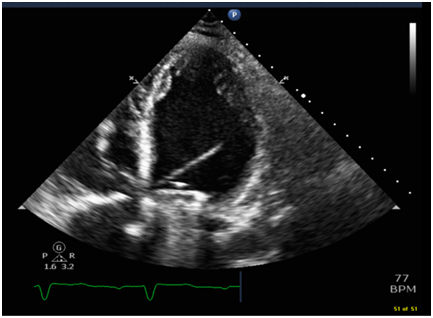 57- year-old women underwent 2 vessel coronary artery bypass grafting (CABG), Mechanical mitral valve replacement and tricuspid valve repair. She required a chest drain insertion for worsening left sided pleural effusion this was done in the surgical intensive care unit using a 12 F pig tail. Shortly following the insertion she started to become breathless and hemodynamically compromised with a drop of her blood pressure and oxygen saturation. It was noted that the chest drain was draining frank blood which was clamped. Chest x-ray revealed an abnormal position of the drain across the heart (Figure 1). Bed side echocardiogram showed the drain traversing the left ventricle (Figure 2). Bubble study through the chest drain showed contrast bubbles inside the left ventricle confirming position of the drain and perforation of the left ventricle (Figure 3). The drain was kept in situ. She was taken to the operating theatre for an emergency left thoracotomy. It appeared that the drain was penetrating the left lung and the left ventricle (Figure 4).