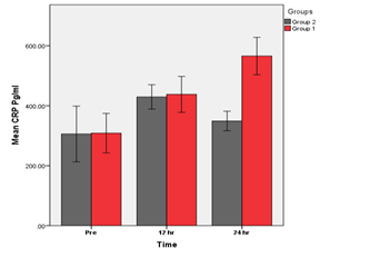 Figure 2 Groups 1 (BVS) vs. Group 2 (DES). A significant increase in hs-CRP at (24) hrs (p<0.05) in group 1 As compared with group 2 was found.