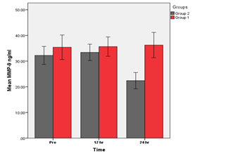 Figure 3 Groups 1 (BVS) vs. Group 2 (DES). A significant increase in MMP-9 at (24) hrs (p<0.05) in group 1 as compared with group 2 was found.