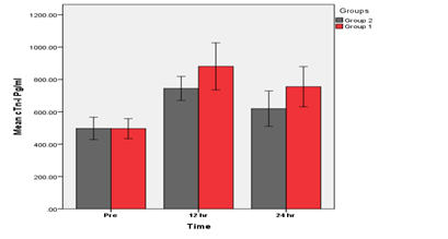 This comparison of the Novolimus eluting stent and Novolimus bioresorbable scaffold implantation showed insignificant increase in levels of cTn-I at (12,24 ) hrs (p>0.05) post implantation in group 1 as compared with group 2 as shown in Figure 5.