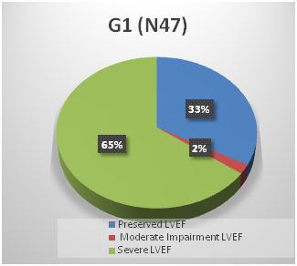 Figure 1 Chart of cakes comparing left ventricular systolic function (LVEF) among patients with myocardiopathy of ischemic-necrotic origin (G1) versus patients with chagasic cardiomyopathy (G2). In both groups, LVEF with severe deterioration predominates. With a higher percentage of LVEF preserved in G2.