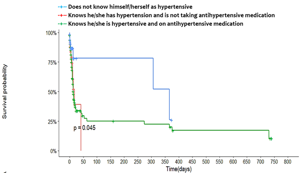 In unadjusted analyses, untreated disease-aware patients had significantly higher mortality than treated disease-aware patients (p=0.045), and untreated disease-unaware patients (p=0.045) (Figure 2). When patients were dichotomized into only two groups according to treatment status at admission, the difference in survival between untreated and treated patients was not significant (p=0.726) (Table 3). All-cause mortality was also significantly higher in male patients (p=0.048) (Table 3), in patients with chronic renal failure (p=0.002) (Table 4), heart failure (p=0.011) (Table 4), in patients admitted with cerebrovascular complications (p<0.001) (Table 5), in patients admitted with hypertensive heart disease (p=0.036) (Table 5), in patients admitted for nephropathy and hypertensive heart disease simultaneously (p=0.006) (Table 5).