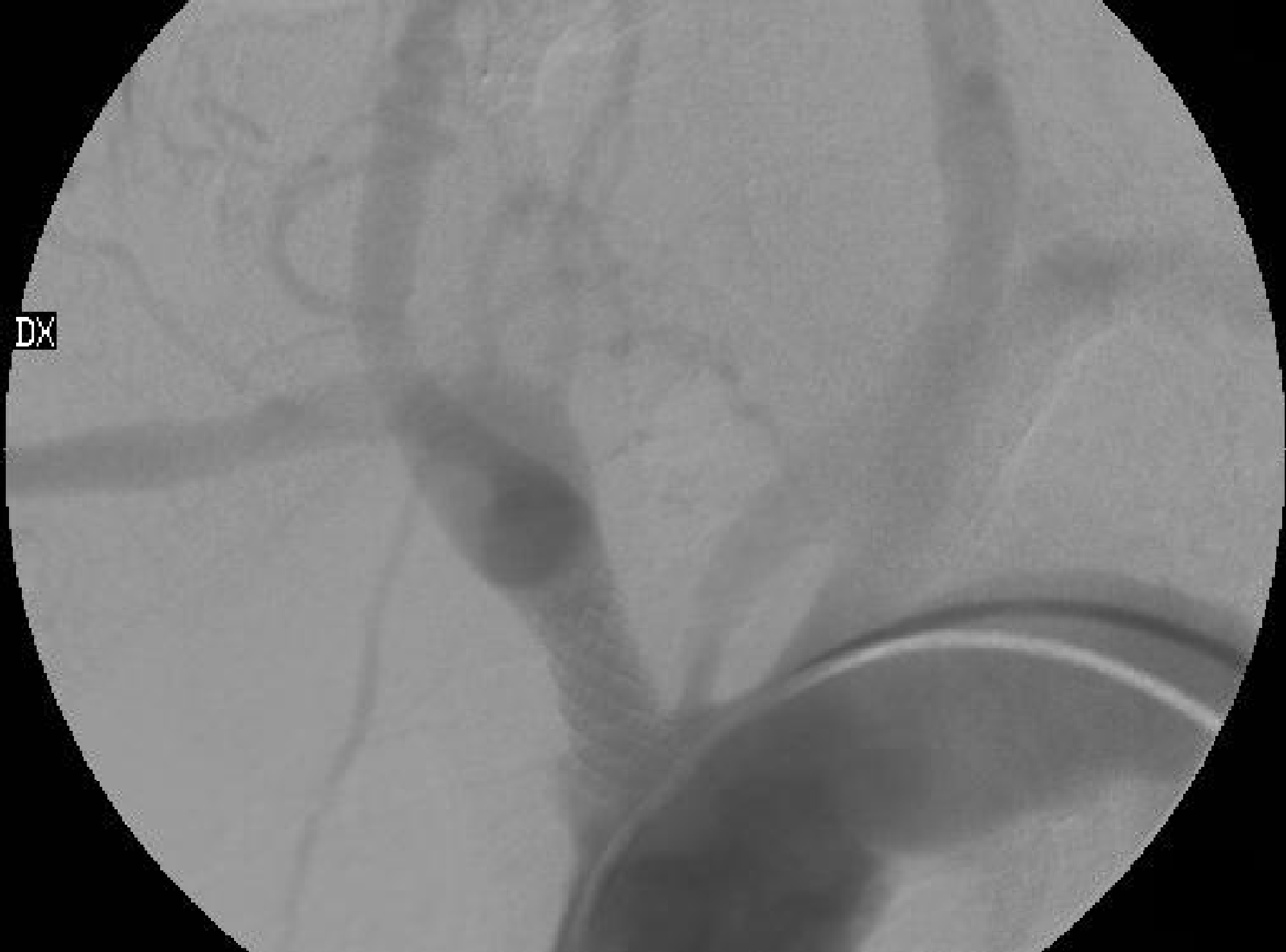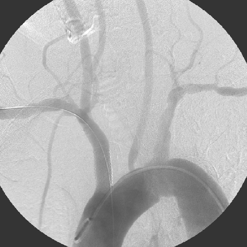 After having chosen the type of stent, its diameter and its length we proceeded to percutaneous puncture of the right humeral artery and we placed a 7 or 8 F Arrow-Flex sheath, 45 cm in length with the intent of placing the sheath in the ascending tract of the aorta. In presence of total occlusion of the innominate artery, before crossing the lesion with the sheath, we passed the occluded tract with a coaxial system represented by a 5F Vertebral catheter with a 0.035-in straight Terumo guidewire. We performed this technique to be less traumatic as possible and with the purpose of carrying the stent to the lesion site, keeping it running into the sheath. After having checked the correct locations of the stent, the sheath was withdrawn proximally and the stent was released. The most suitable angiography projection for the release of the stent is the left oblique, the right oblique projection is used to evaluate the bifurcation of the innominate artery into its branches: the right subclavian artery and the right common carotid artery.