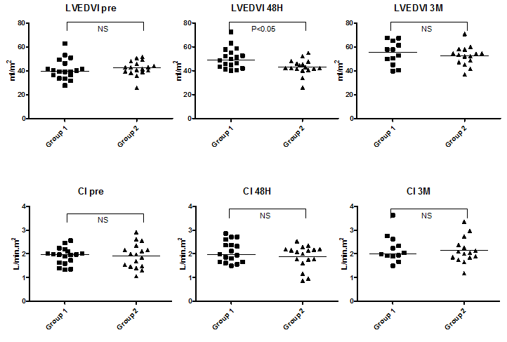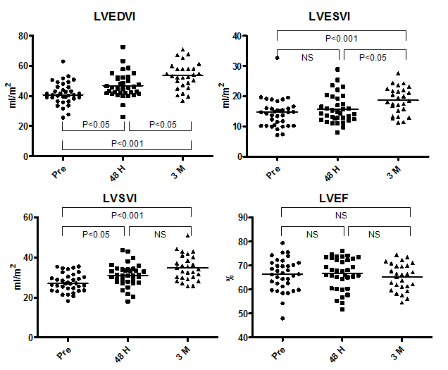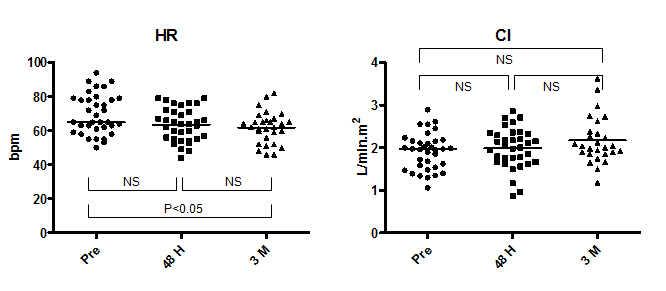 The median LVEDV index and LVESV index before ASO was 40.8 ml/m2 (range, 25.6–62.9 ml/m2) and 14.7 ml/m2 (range, 7.1–32.7 ml/m2), respectively (Figure 2). The median LVSV index and LVEF before ASO was 27.0 ml/m2 (range, 18.2–35.5 ml/m2) and 66.4% (range, 48.0–79.4%), respectively. There was a significant increase in LVEDV index and LVSV index (LVEDV index, 45.5; range, 26.1–72.5) and in LVSV index (31.0; range, 18.1–43.6) at 48 hours after ASO; the average increment was +13.0% and +13.5%, respectively. During the chronic phase, LVEDV index increased further to 53.4 ml/m2 (range, 36.9–70.9 ml/m2) with an average increment of +17.0% from the 48-hour time point and a total increment from baseline of +28.9%. As LVESV index showed a significant increase during the chronic phase from 14.4 ml/m2 (range, 8.0–28.9 ml/m2) at 48 hours to 18.5 ml/m2 (range, 11.2–27.6 ml/m2) at 3 months, the change in LVSV index (34.1 ml/m2; range, 25.6–50.9 ml/m2 at 3 months) during this phase was not significant, but the increment from baseline was significant (P<0.001). The median LVEF remained unchanged during follow-up (66.4% (range, 48.0–79.4%) at baseline, 67.5% (range, 51.6–76.0%) at 48 hours, and 66.3% (range, 54.5–74.5%) at 3 months. In contrast, heart rate (HR) decreased from 65 bpm (range, 50–94 bpm) at baseline to 64 bpm (range, 44–79 bpm) at 48 hours (P=NS) and to 62 bpm (range, 46–82 bpm) at 3 months (48 hours vs. 3 months: P=NS; baseline vs. 3 months: P<0.05) (Figure 3). Despite the increase in LVSV index after ASO, the simultaneous decline of HR resulted in maintenance of CI during the follow-up period (2.0 L/min.m2 (range, 1.1–2.9 L/min.m2) at baseline, 2.0 L/min.m2 (range, 0.9–2.9 L/min.m2) at 48 hours, and 2.0 L/min.m2 (range, 1.2–3.6 L/min.m2) at 3 months).