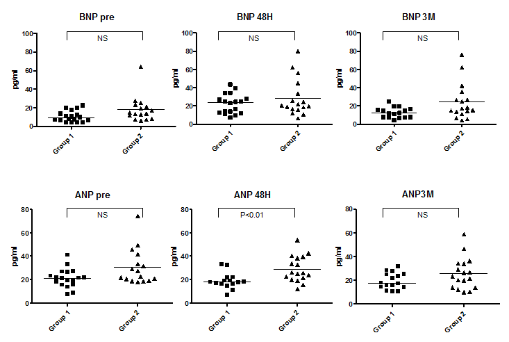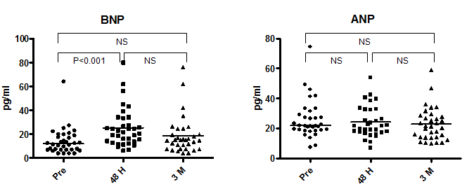 The median plasma BNP and ANP levels before ASO were 12.1 pg/ml (range, 4.0–64.3 pg/ml) and 21.8 pg/ml (range, 7.6–74.5 pg/ml), respectively (Figure 4). The BNP increased significantly at 48 hours (21.8 pg/ml (range, 6.3–80.1 pg/ml vs. baseline: P<0.01) and returned to baseline levels at 3 months (15.0 pg/ml (range, 4.0–76.2 pg/ml) vs. 48-hour P=NS; vs. baseline P=NS). The ANP showed no significant change during follow-up (21.8 pg/ml (range, 7.1–54 pg/ml) at 48 hours, and 21.5 pg/ml (range, 10.2–59 pg/ml) at 3 months).