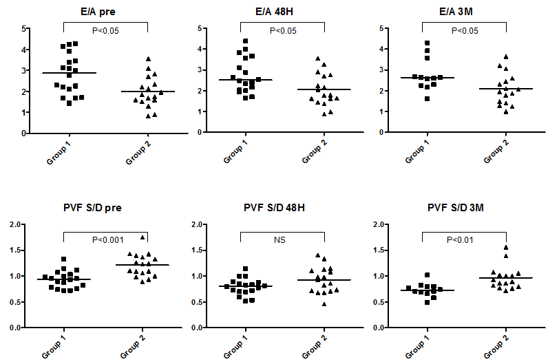 Results: LV end-diastolic volume index was 40.8 (25.6–62.9) ml/m2 at baseline, 45.5 (26.1–72.5) (p<0.05) at 48 hours and 53.4 (36.9–70.9) at 3 months (p<0.001). Group#1 (n=18) included those with significant increase of LV volume after ASO at 48 hours, while Group#2 (n=17) included those without LV volume change. LV inflow-E/A was significantly lower and pulmonary venous-S/D was significantly higher in Group#2 (E/A: 1.9 (0.8-3.6); S/D: 1.2 (0.9-1.8)) than in Group#1 (E/A: 2.9 (1.4–4.3); S/D: 0.9 (0.7–1.3)), and this difference persisted in the chronic phase after ASO. Serum atrial natriuretic peptide at 48 hours was significantly higher in Group#2 (25.6 (12.0–54.0) pg/ml) than in Group#1 (18.1 (7.1–33.1)). These results suggest the acute response of LV volume is significantly influenced by the intrinsic LV diastolic function, and the significantly high serum atrial natriuretic peptide concentration in Group#2 at acute phase might be caused by the increased left atrial pressure after ASO due to relatively reduced diastolic function of LV in this group.