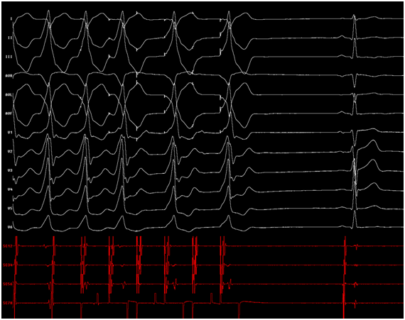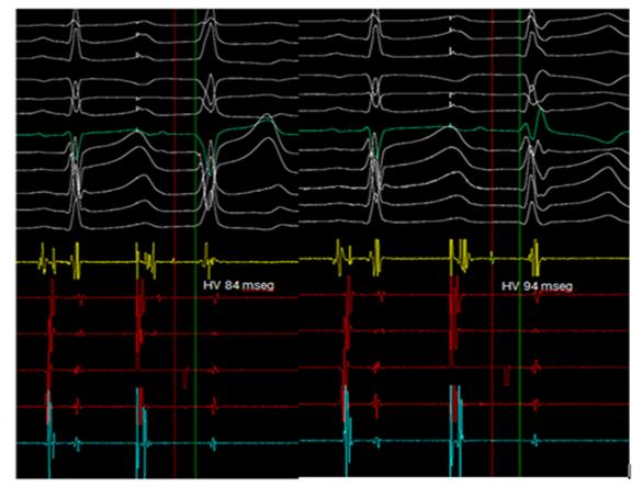 Certainly, the patient presented a regular, wide QRS complex tachycardia, with right bundle branch block morphology in precordial leads, inferior axis and positive precordial concordance (Figure 1). During the electrophysiological study, a decapolar catheter was placed in the coronary sinus, a quadripolar catheter in His, and another in a right ventricle tip. The baseline conduction times were within normal limits. During oversensing extra stimulation and with programmed atrial stimulation with decreasing cycles, progressive widening of the QRS complex was observed with left bundle branch block morphology but with a negative QRS complex in aVL and prolongation of the HV interval up to 84 msec. With even shorter cycles, the QRS complex morphology changed to right bundle branch block with greater prolongation of the HV interval up to 94 msec (Figure 2). With programmed atrial stimulation in the proximal coronary sinus, we observed a dual AV nodal pathway physiology with a single narrow echo beats. With shorter cycles and longer AV prolongation, clinical tachycardia was induced (Figure 3). This tachycardia presented an atrio-ventricular ratio of 1 to 1 with concentric retroconduction and variable VA intervals (mostly short).