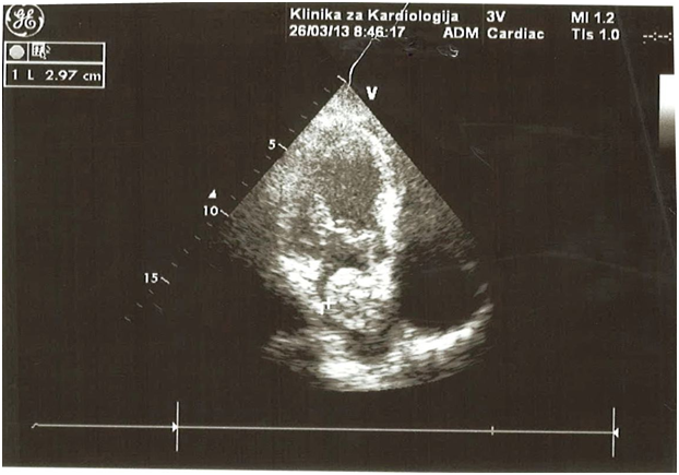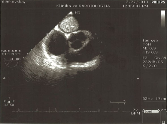 Our patient was 50 years old female who visited our clinic because of the high blood pressure (2-3 years duration, regularly treated with antihypertensive therapy). One day before hospitalization patient was diagnosed an intracavital mass in the left atrium on ehocardiographic examination, highly suspected for cardiac myxoma. Right upon detection, patient was admitted to our clinic for further examination. She was asymptomatic with stable vital signs and normal physical examination findings. During the hospitalization period we performed: