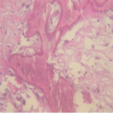 Transthoracic echocardiogram (Figure 2) (Figure 3) revealed a large atrial mass occupying the majority of the left atrium with dimensions 2,97 x 4,28cm with no obstruction of the mitral valve orifice. Transesophageal echocardiography (Figure 4) (Figure 5) confirmed presence of a large mass in the left atrium attached to the interatrial septum without prolaps of the tumour through the mitral valve. After coronary angiography and completion of preoperative dignostics, patient was transferred in another institution for surgical treatment. After surgical removal of the cardiac tumour, we received the histopathological material (Figure 6) which confirmed the diagnosis of cardiac myxoma. We continued with follow up of the patient by echocardiography control right after surgical treatment, as well as after 3 months, after 6 months, and after 12 months with no signs of tumor recurrence. She feels well and continues to take regularly antihypertensive drugs.7–9