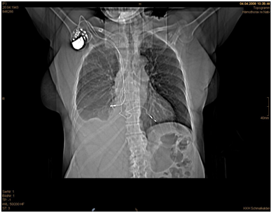 A 65-year old woman was urgently admitted in our institution with hemothorax one week after transvenous bichamber pacemaker implantation. The right– sided ventricular lead was successfully implanted but the right atrial lead was dislocated despite active fixation. The patient showed an impaired circulation with respiratory problems but no arrhythmias. The postoperative pacing control showed a dysfunction of the right atrial lead. A routine chest X-ray and computer tomography showed no signs of pneumothorax but pleural and pericardial effusions (Figure 1 & 2).