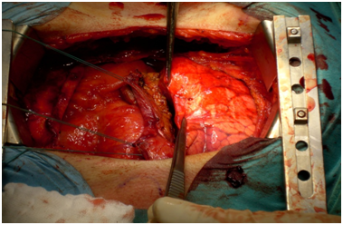 Laboratory examination showed a low haemoglobin level while the other values were in normal rage. Four hours after admission the patient developed more chest pain, respiratory fatigue and became hypotensive. Emergency surgical exploration was decided and performed with median sternotomy. After sternotomy and heart exploration 300 ml bloody pericardial effusion could be extracted. A perforation was found in the middle of the right atrium from the lateral side, with the dislocated lead perforating the pericardium and causing a right lung penetration (Figures 3–5). The lead was pulled out of the right atrium about 10 cm and cut off. After invagination of the cut off atrial lead in the right atrium the perforated atrium was sewn using a purse-string suture (Prolene 5x0 BB). After opening and exploration of the right pleura 300 ml fixed haematoma and 700 ml bloody pleural effusion were extracted. Subtle inspection of the right lung and sewing of the injury was performed. Chest closure was then performed after placement of two drainage tubes, one retro - cardiac and one right pleural (Figure 6). The patient had a normal recovery without any complications. The patient was discharged after eight days and was planned for a later atrial lead implantation in the future.