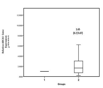 The demographic and biochemical data is depicted in Table 1. Group 1 and 2 subjects were age and BMI matched. Total cholesterol (TC) levels in Group 2 were marginally less by 12.3% (p<0.01) while HDL-C levels (35.7%, p<0.001) were significantly low with TC to HDL Cholesterol ratio (34.2%, p<0.001) and LDL-cholesterol (LDL-C) to HDL-C ratio (40.6%, p<0.001) high as compared to Group 1. Significant low levels of Apolipoprotein A1 (Apo A1) (20.7%, p<0.001) and high in ApoB/A1 ratio (22.3%, p<0.05) were also observed in Group 2 as compared to Group 1. LDL-C and triglyceride levels were not significantly different between two groups. ABCA1 gene expression of Group 2 was compared against age, gender and BMI matched individuals of Group 1. The ABCA1 gene expression of Group 2 was more by 65% then Group 1 (Figure 1). The mean absorbance of ABCA1 protein of Group 2 was significantly low by 17.5% (p<0.0001) as compared to healthy individuals with normal HDL-C level (Group 1) (Table 2). Pearson correlation (r) analysis of overall data demonstrated significant positive correlation of ABCA1 Protein with HDL-C (r=0.393, p=0.003) and Apo A1 (0.401, p=0.002) while negative correlation with LDL-C/HDL-C (r=-0.350, p=0.009) and TC/ HDL-C (r=-0.342, p=0.011).