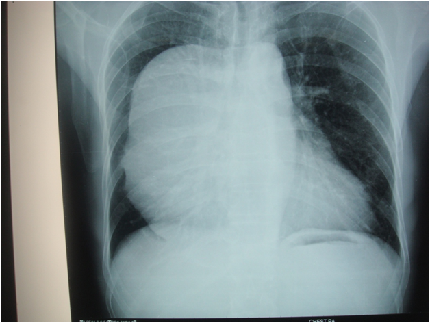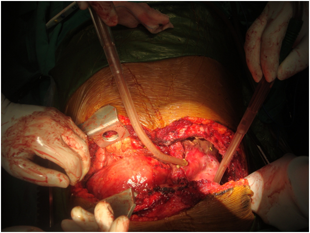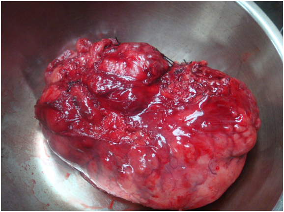 Thymoma with Myaesthenia Gravis-total thymectomy along with removal of mediastinal fat, adjacent pleura, fatty tissue and small part of pericardium was removed. Large fibro sarcoma (8.5 kg)–malignant mesenchymal tumour, excision of 1-4 ribs posteriorly, partial removal of left scapula and partly left pleura was exised. Myxid liposarcoma-adherent to great vessels pleura, chest walls, lungs, diaphragm and heart-frozen section biopsy was down-malignancy-sample of tissue was then sent for histopathology. Clamshell-curvalinear bilateral sub mammary incision was performed extending from one mid axillary line to the opposite across the anterior aspect of chest, histopathologically found mature cystic teratoma-30x10x6 cm. Spindle cell thymoma exposed by anterolateral thoracotomy in 70 years old gentleman, very large tumour between upper and middle lobe of right lung and in front of helium of right lung, was firmly adherent to Supirior Venacava -small tear in Superior Venacava repaired by 6/0 prolene. Right mediastinal mass--FNAC showed benign cystic teratoma. During operation found inoperable--frozen section biopsy showed malignancy-further surgical procedure abandoned as it was densely adhernt to lung, pericardium and diaphragm (Figures 1-10).