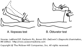 Pain on hyperextension of right thigh in lateral decubitus position (retroperitoneal retrocecal appendix) |