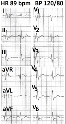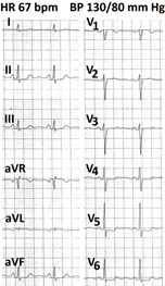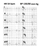 A 67 year-old-female presented with complaint of angina on effort. Family history was not contributory. Fasting lipid profile and glycosylated haemoglobin levels were normal. Resting, supine electrocardiogram was normal (Figure1). Resting, supine heart rate was 54 beats per minute. Resting, supine blood pressure was 130/80 mm Hg. Examination of cardiovascular system and respiratory system was normal. Detailed echocardiographic examination did not reveal any abnormality. During second stage of treadmill stress test, patient complained of chest discomfort. Electrocardiogram showed sinus tachycardia (heart rate-115 beats per minute) and significant ST segment depression in leads I, II, aVF, V4 ,V5, V 6 and ST segment elevation in leads aVR and V1 (Figure 2). However, the patient felt that she could continue exercise. Gradually her discomfort reduced and heart rate started decreasing. By the end of third stage chest pain had disappeared and heart rate dropped to 82 beats per minute. Although the systolic blood pressure increased to 160/80 mm Hg, rate pressure product declined from 16100 at the end of second stage to 13120 at the end of 3rd stage. There was significant normalization of ST segment deviations (Figure 3). Patient could exercise for nine seconds during stage 4 without recurrence of angina or ST segment changes in electrocardiogram. There was no recurrence of angina or any fresh change in electrocardiogram during recovery (Figures 4&5).