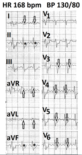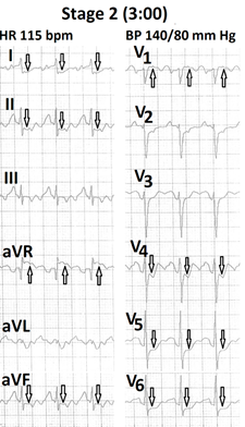 Figure 7 Electrocardiogram recorded at the end of the first stage of Bruce protocol showing sinus tachycardia (168 bpm) with horizontal ST segment depression in leads I, V2 to V6 (marked ), slow upsloping ST segment in leads II, aVF (marked ↓) and ST segment elevation in lead aVR and aVL (marked ↑).
