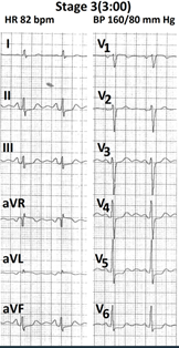 Figure 3 Electrocardiogram recorded at the end of third stage of Bruce protocol showing heart rate of 82 bpm with significant reduction in ST segment depression in leads I, II, aVF and V4.