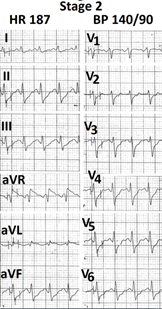 A 42 year-old-female presented with history of angina on effort. Family history was not contributory. Fasting lipid profile and glycosylated haemoglobin were normal. Resting supine heart rate was 99 beats per minute. Resting, supine blood pressure was 120/80mm Hg, Resting twelve lead electrocardiogram was normal (Figure 6). Detailed echocardiographic examination did not reveal any abnormality. Towards the end of stage 1 of treadmill test, patient complained of mild chest discomfort. Heart rate was 168 beats per minute and blood pressure was 130/80 mm Hg. Rate pressure product was 21840. ECG showed significant horizontal ST segment depression in leads I, V2 to V6 , slow upsloping ST segment depression in leads II and aVF and ST segment elevation in leads aVR and aVL (Figure 7) Patient continued exercise. By the end of stage 2, chest discomfort disappeared and ST segment depression became rapid upsloping (Figure 8). Heart rate was 187 beats per minute and blood pressure was 140/90 mm Hg. Rate pressure product was 26180.