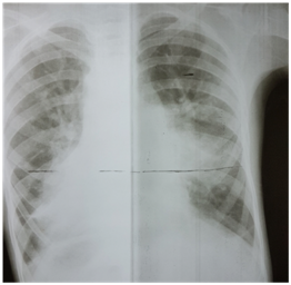 Figure 1 Chest X-ray showed cardiomegaly, and bilateral lung plethora. There were additional patchy infiltrates scattered over the lung fields bilaterally.