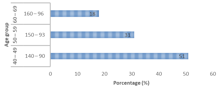 Regarding Figure 2, we note the distribution of the home blood pressure measurement according to the age of the high Andean inhabitants of the province of Huamanga, that 110 people attended with ages between 40 and 49 years of age obtained a mean of 140 to 90mmHg of blood pressure, constituting 51% followed by people with ages of 50 to 59years with 150 to 93mmHg of blood pressure, constituting 31% and in third place people with ages between 60 to 69 years of 160 96mmHg corresponding to 18% which shows that children and young people go to study in the city, some of them are not used to the way of living in the countryside, only the adults are cultivating, herding and caring for their humble abode. In other words, there is a small percentage of adults who are farmers or small ranchers or animal shepherds, who stayed to form their new family and dedicate themselves to work corresponding to the subsistence of their progeny, they do not migrate to the city because they do not have relatives, thus they manifest it.