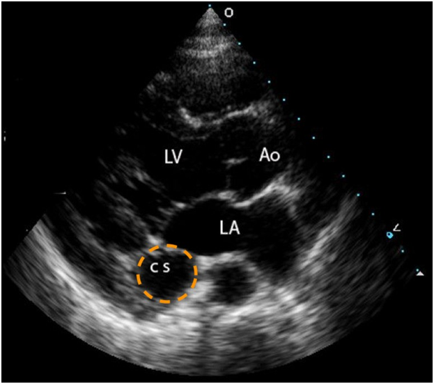 Figure 2 Echo cardiogram: parastern all on gax is view, observing dilated coronary sinus(CS), Aorta(AO), Left Atrium(LA), Left Ventricle(LV).