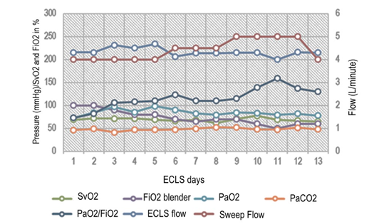 Left axis describe blood gas parameters (mmH g) and venous saturation from de Cardiohel p console (%). Right axis show ECLS Flow and Sweep FI ow in Litres per minute (L/min).