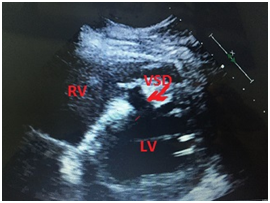 Patient was thrombolysed properly, intubated and sedated and taken to cath lab for urgent PTCA. Echocardiography also showed severe LV systolic dysfunction, a kinetic mid and apical portions, large ventricular septal defect VSD sized 1.3 cm in the form of an oblique tunnel with significant left to right shunt (Figure 1).