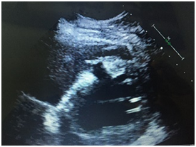 Patient was observed gain in cardiac intensive care unit and his vital signs started to be more stable so that IABP was removed and gradual weaning from high doses inotrops was achieved within 4 days. After 7 days patient was extubated and kept under observation due to pneumonia and CNS disturbances but after 10 days he improved dramatically and shifted to the ward before discharge home. Final echocardiography showed: VSD device in place with trivial residual shunt (Figure 4).