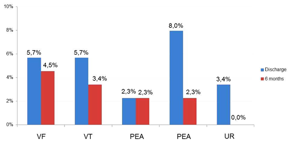 Figure 2 In-hospital and 6 month survival in cardiac arrest patients admitted according to admission rythm. (VF: Ventricular fibrillation. VT: Ventricular tachycardia. PEA: Pulseless electric activity. Asyst: Asystole. UR: Unknown rythm).