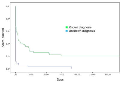 Figure 3 Survival in days for cardiac arrest admitted patients according to certainty of diagnosis (known etiology versus unknown etiology) p=0,003.
