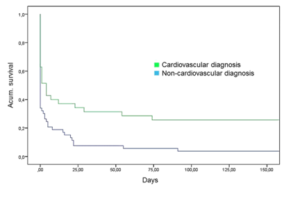 Results: Cardiovascular causes of cardiac arrest corresponded to 39.8%. In-hospital survival and 6 months survival was 25% and 12,5% respectively. Variables associated to worse prognosis in the univariate analysis were non-cardiovascular cardiac arrest (OR 8.8; CI 1.7-43; p=0.003), unknown cause of cardiac arrest (OR 1.79; CI 1.46-2.18; p=0.003), but no variable was an independent predictor in multivariate analysis. Mean survival was 76 days, and survival in patients discharged alive was 297 days (median 161 days). At follow-up patients had worse prognosis if admitted for non-cardiovascular origin of cardiac arrest (p=0.003), patients without clear origin of cardiac arrest (p=0.0001); and patients with non-shockable rhythms on admission (p=0.009).