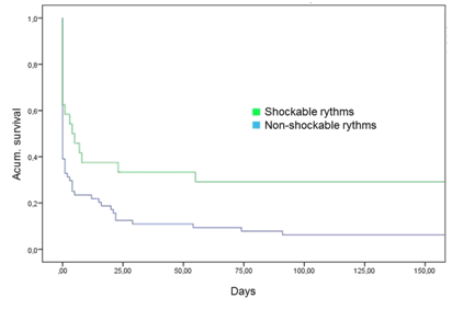 Event free survival curve shows that there is worse prognosis in patients without a certain etiology of cardiac arrests (Figure 3) p=0,0001; in patients admitted with a non-cardiovascular origin of cardiac arrest (Figure 4) p=0,003; and in those patients admitted with non-shockable cardiac rythms (Figure 5) p=0,009.