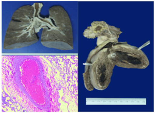 Considering the previous signs and laboratory parameters; treatment was started with antibiotic ceftriaxone 50 mg/kg and requirement fluid therapy; she evolved with cardiopulmonary deterioration; with persistent desaturation with 100% inspired oxygen, increased respiratory effort and sinusal tachycardia; we performed endotracheal intubation followed by clinical deterioration with hypotension, bradycardia and cardiac arrest; we started advance CPR, during the maneuvers she developed ventricular arrhythmias, fibrillation with no response to treatment and no return to spontaneous circulation, declaring time of death 10:00 in the morning. An autopsy was performed and reported the presence of a pulmonary thrombosis and an atrioventricular intracavitary thrombi (Figure 2 & 3).