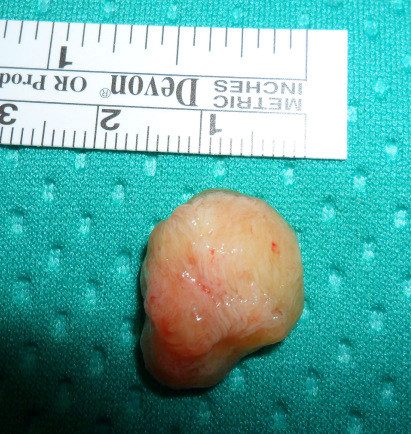 We describe the case of a 54year old male, completely asymptomatic, with hypertension as unique cardiac risk factor. During routine check-up a cardiac echo showed a grossly spherical mass attached to the ventricular side of the pulmonary valve; and was scheduled for trans esophageal echo at our Institution. The presence of the mass was confirmed, mobile across the valve during cardiac cycle, apparently arising from the ventricular surface of the posterior leaflet of the pulmonary valve. The dimensions were measured 17x17mm. The ventricular function was normal, whereas the aortic valve showed up to be bicuspid, normally functioning, with a dilated ascending aorta (45mm). In consideration of the extreme mobility of the mass and of its dimensions, carrying the risk of actual pulmonary embolization, the patient was promptly anticoagulated and after a few days operated. Through median sternotomy, on cardiopulmonary bypass with short aortic cross clamping (10minutes), the excision of the mass was performed through transversal incision of the pulmonary artery, with complete shaving and sparing of the valve. The postoperative course was uneventful and the patient was discharged on the 6th postoperative day. The histopathological exam confirmed the diagnosis of CPF.