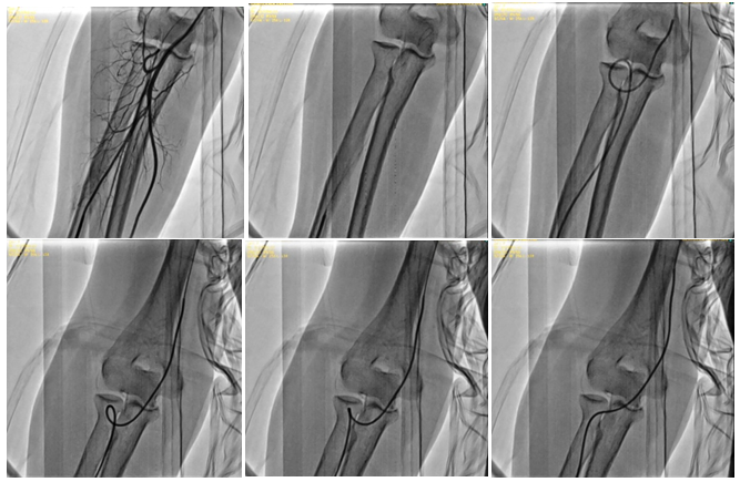RAA are relatively common in general population, although there are limited data concerning this issue worldwide [4]. Their incidence may vary according to the available literature, starting from 8,8% [7,6], 13,8% [2], up to 22,8% according to Valsecchi et al. [3]. They can be reason for procedural failure in 1-5% of the patients even in experienced operators` hands [4,9]. RAA include high bifurcating origin of the radial artery (high take-off radial artery) (Figure 1), radial artery loop (Figure 2 & 3), tortuosity (Figure 1), hypoplasia and stenosis. In most cases, these anomalies can be overcome by using hydrophilic guiding wire and diagnostic 5F Judkins right catheter (JR 4) or even 4F Judkins right catheter, sometimes 0,014” hydrophilic coronary wire [1] and in rare cases by using so-called BAT technique (“balloon-assisted tracking”), a technique proposed by Dr. Tejas Patel et al. [9]. Operators should be experienced in TRA and by using some simple maneuvers like push-and-pull technique and catheter rotation usually achieve a successful negotiation with the radial artery (Figure 4).