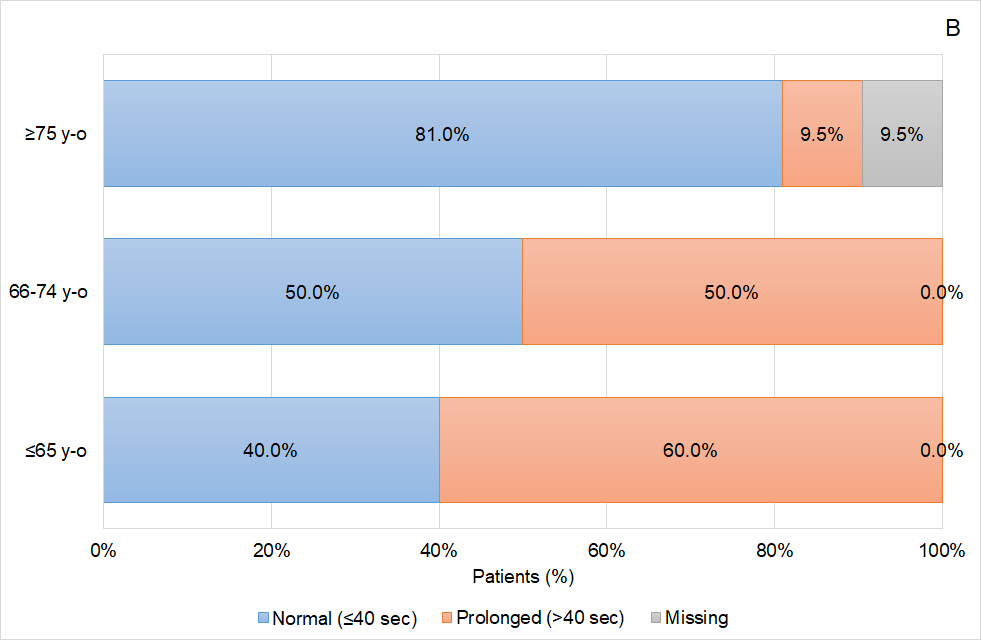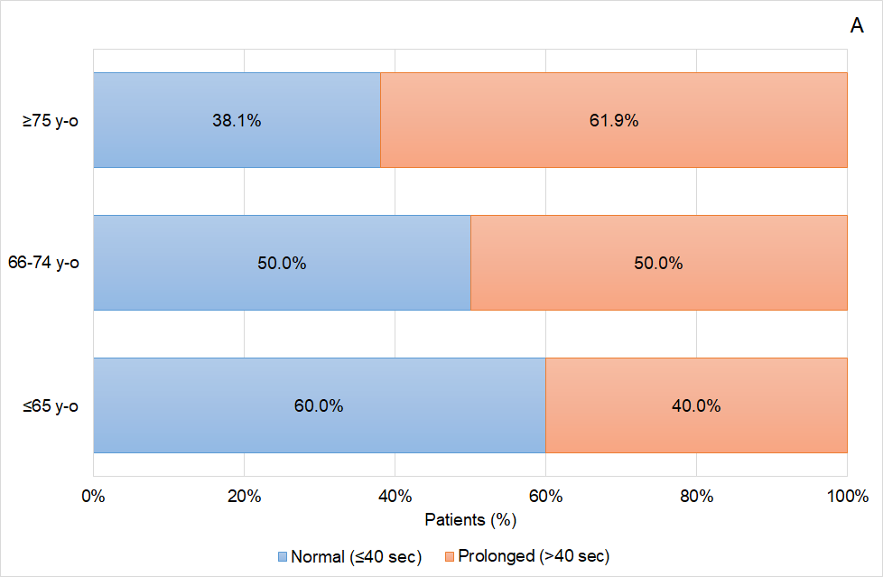 Figure 2 Coagulation status of the patients based on the activated Partial Thromboplastin (aPTT) time according to patients’ age (A) prior to idarucizumab infusion, and (B) 24 hours after idarucizumab infusion.