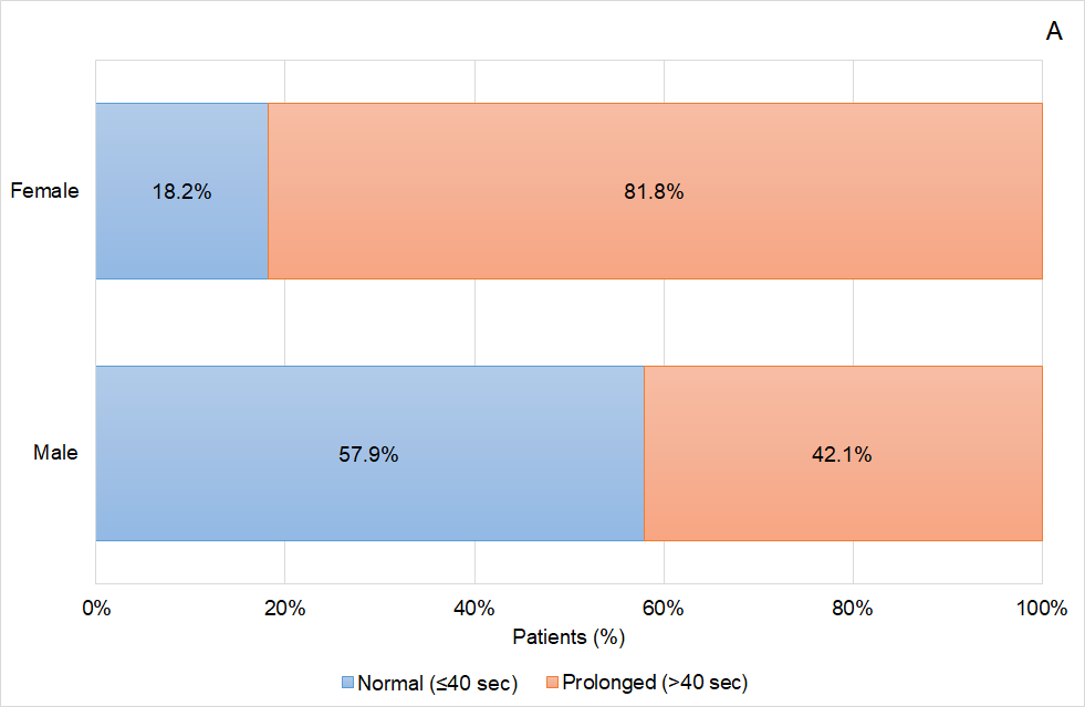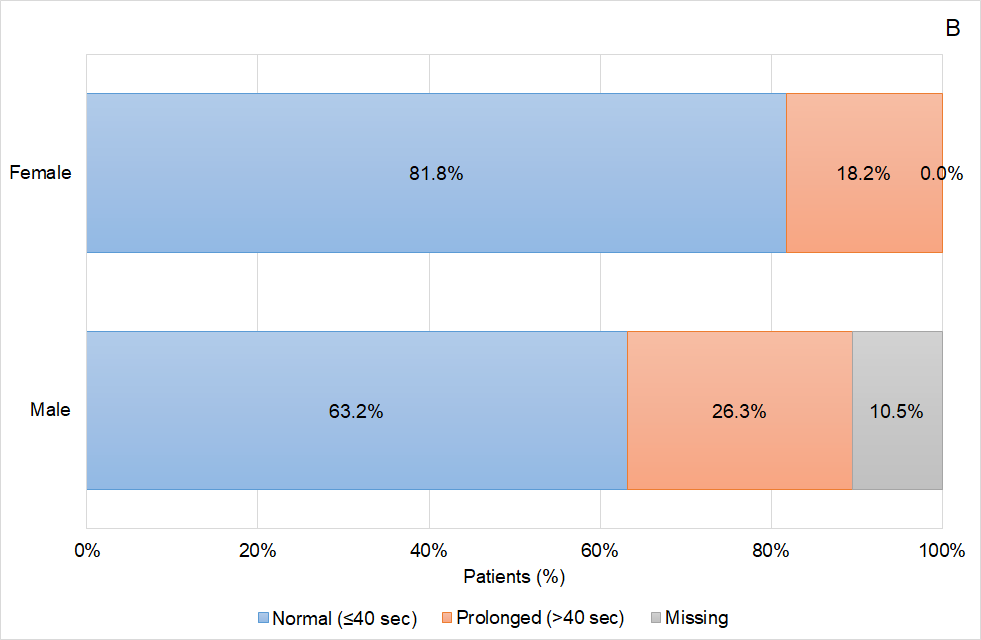Figure 3 Coagulation status of the patients based on the activated Partial Thromboplastin (aPTT) time according to patients’ gender (A) prior to idarucizumab infusion, and (B) 24 hours after idarucizumab infusion.