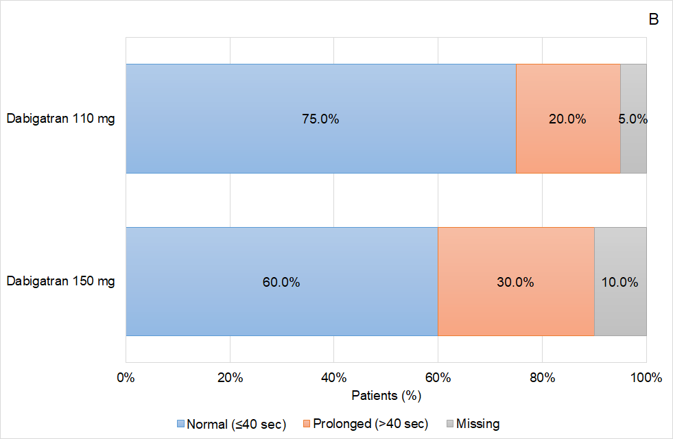 Figure 4 Coagulation status of the patients based on the activated Partial Thromboplastin (aPTT) time according to the dabigatran dose used (A) prior to idarucizumab infusion, and (B) 24 hours after idarucizumab infusion.
