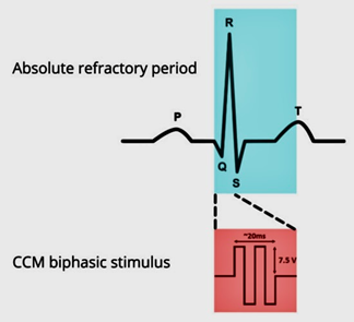 CCM is an emergent therapy, it employs standard pacing electrodes to deliver non-excitatory high-voltage biphasic impulses (~7.5 V/20ms) duration during the absolute refractory period of the action potential of cardiac myocytes (Figure 1).13,22