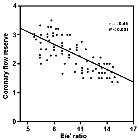 Correlation analysis (table-3) shows that METs was significantly correlated with CFR (r=0.48, p<0.001), and negatively associated with E/e' ratio(r=−0.28, p<0.05) and LAVI (r=−0.31, p<0.05), hs-CRP (r=-0.39, p<0.001), hs-troponin T (−0.25, p<0.05) and BNP (r=−0.31, p<0.03). Likewise, the CFR has a significant correlation with E/e' ratio (r = −0.45; P < 0.001) (Figure 2).