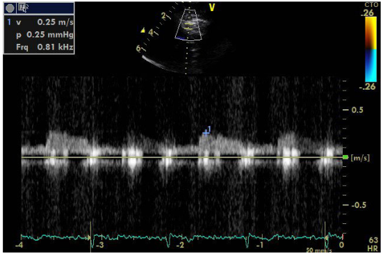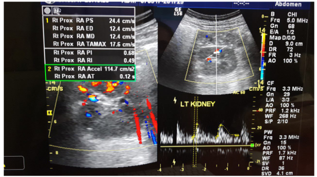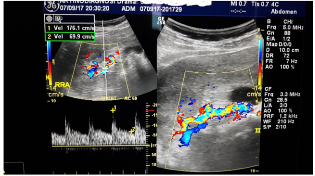 Resistance index 0.49 (RI:0.6-0.7), is a general indicator of renal parenchymal disease. In patients with severe renal artery stenosis >75-80%, in the early stages of the disease the resistance index is low (RI<0.6). Is attributed to marked vasodilation promoted by self-regulating endothelial mechanisms and aimed at protecting the ischemic kidney. As the disease develops and affects the renal parenchyma, the vascular resistance increases and consequently increase RI>0.8. The resistance index has not only diagnostic but also predictive value: RI>0.8 indicates severe parenchymal disease and is an unfavorable indicator of renal function repair and correction of arterial hypertension after reperfusion.
