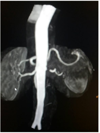 The acceleration time 0,12s (AT:<0,07sec), indicative renal low flow. The patient was then subjected to magnetic angiography of renal arteries (MRA) confirming the triplex’s findings: 90% stenosis of left renal artery immediately after the outgrowth of the abdominal aorta (Figure 4). In the radioactive nephrogram, impaired left kidney function is demonstrated at 36% in the relative involvement of total renal function (split function), as opposed to the right kidney that contributes to 64% of glomerular function (Figure 5). In the same test was calculated with gates technique the GFR in the right kidney at 76.2ml/min/1,73m2,while in the left kidney 26.6ml/min/1,73m2.