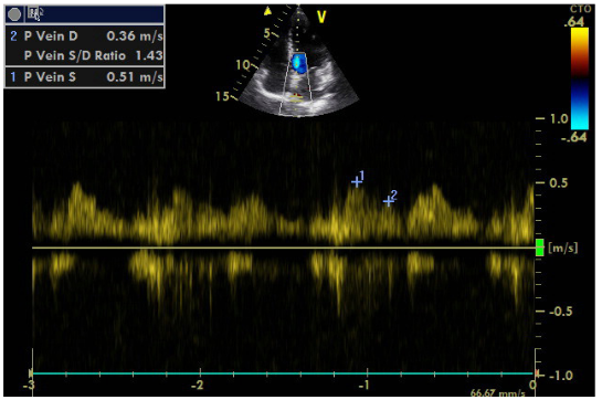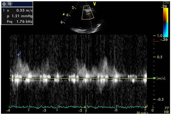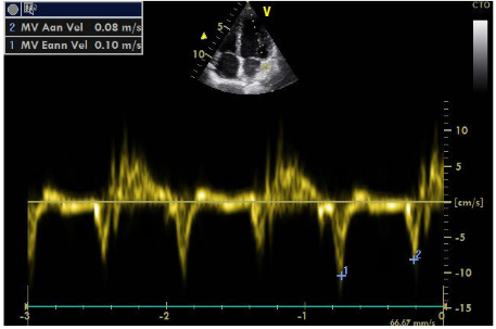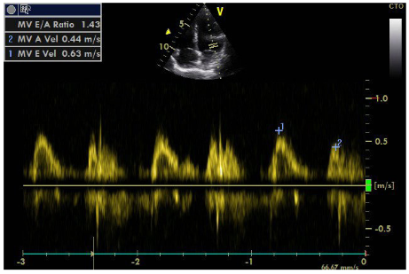 An additional element is the localization of the stenosis in the initial part of renal vessel, as opposed to FMD that commonly affects the middle and peripheral portions. The sudden deterioration of renal function within a short period of time also advocates for atherosclerosis as the FMD has a slower course. It is noted that atherosclerosis may lead to complete abstraction/thrombosis over time, rarely occurring FMD. Finally, the immunological test performed to rule out vasculitis was negative. Renal arteriography indicated a 99% stenosis to the left and the patient underwent a successful stent implantation. After angioplasty, blood pressure returned to normal and the patient did not receive any medication. It is worth noting that despite the presence of stage III hypertension and the underlying disease, the patient did not show signs of diastolic dysfunction in the Doppler (Figures 8–10), nor any signs of hypertrophic left ventricle in ECG. Not a patient with long-standing uncontrolled hypertension. Moreover, to stress echocardiography with doboutamine there were no wall motion abnormalities, while coronary flow reserve was normal (CFR LAD=2.2) (Figure 11A & 11B).