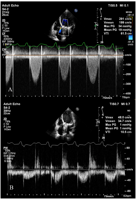 Figure 1 The initial transthoracic echocardiography of the patient showing A. prosthetic aortic valve (AV) mean gradient and VTI; B. Left ventricular outlet (LVOT) mean gradient and VTI. The DVI (LVOT VTI/AV VTI) was: 0.17.